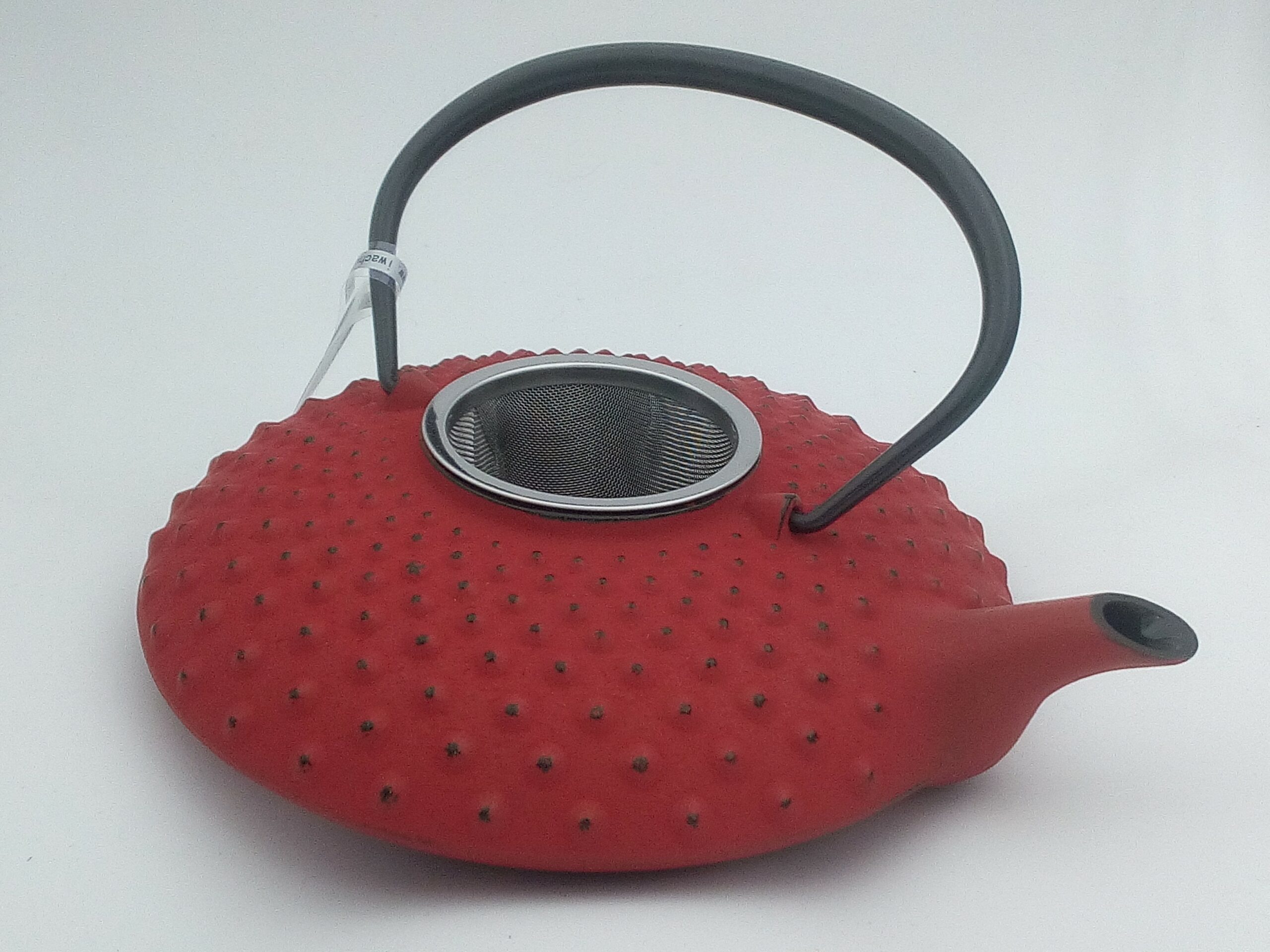 Emaillée à l’intérieur, cette grande théière de forme plate a une contenance de 0,8 Litre.